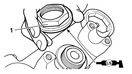 b.Remove the bearing race from the lower bracket with a chisel “2” and a hammer.