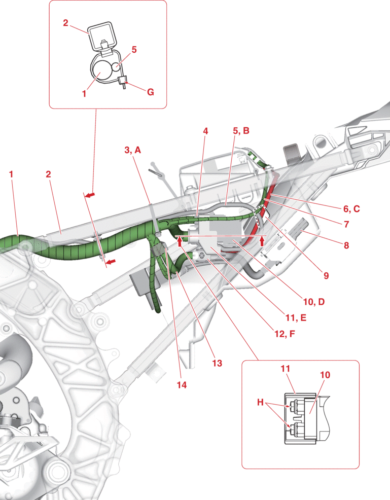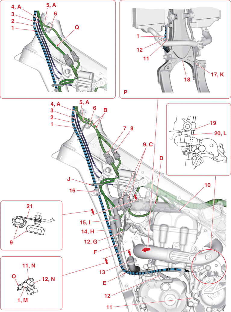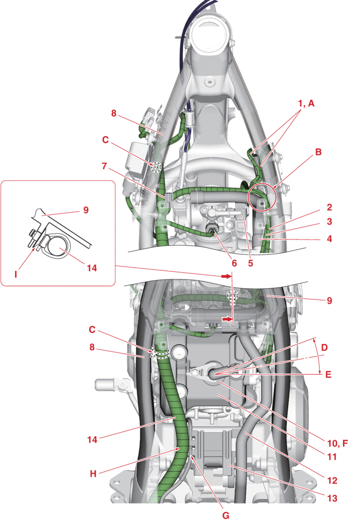 Route the starter motor lead between the starter relay and the rear fender. Adjust any slack between the starter relay and the plastic locking tie of the rear frame. |