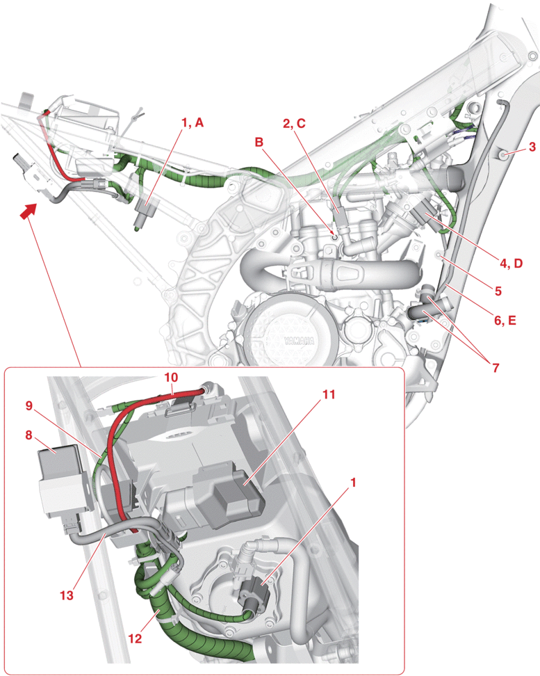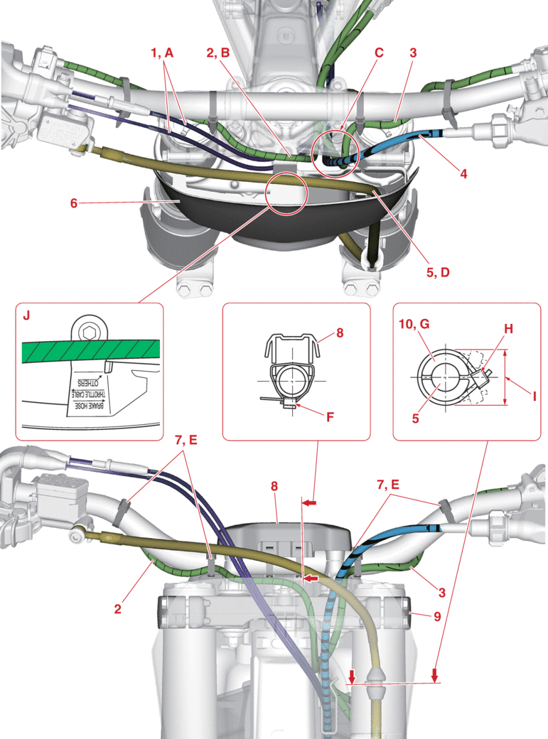 Adjust slack in the handlebar switch lead (left) and start switch lead at the vehicle’s front side of the cable holder. |
