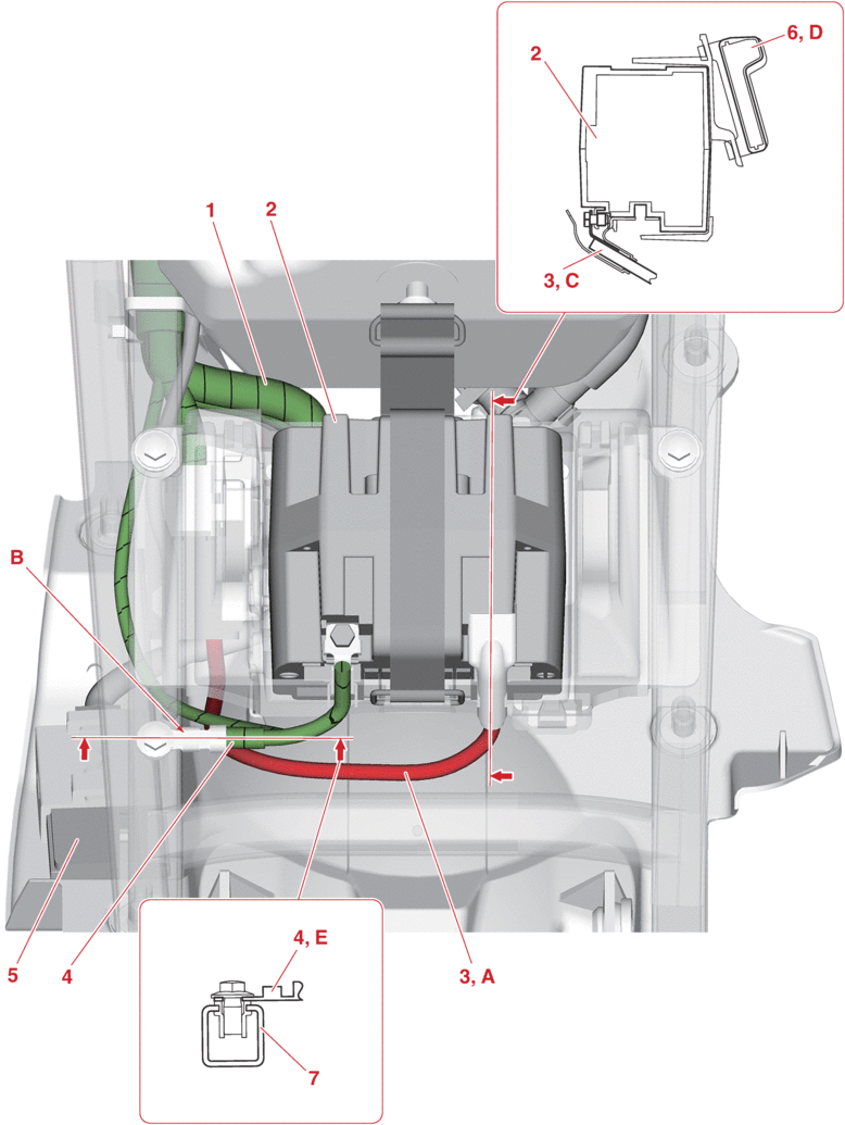 Insert the CCU coupler into the battery bracket so that the coupler is located on the inside (of the vehicle), and then secure it. |