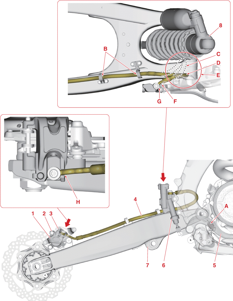 Route the rear brake hose so that it is not bent as shown by the double-dash line. |