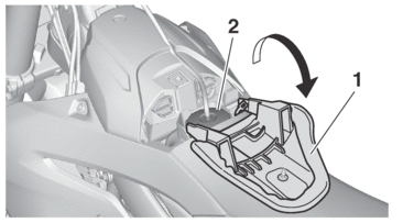2.Remove the sub-seat “1” to open the fuel tank cap “2”.